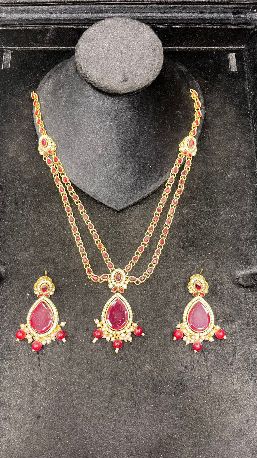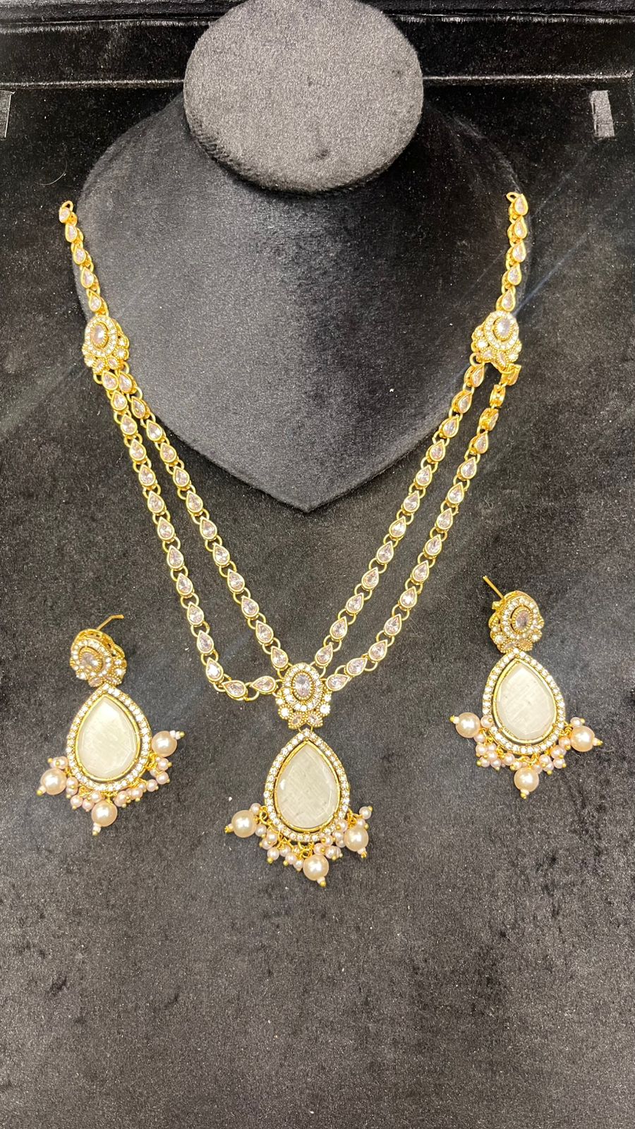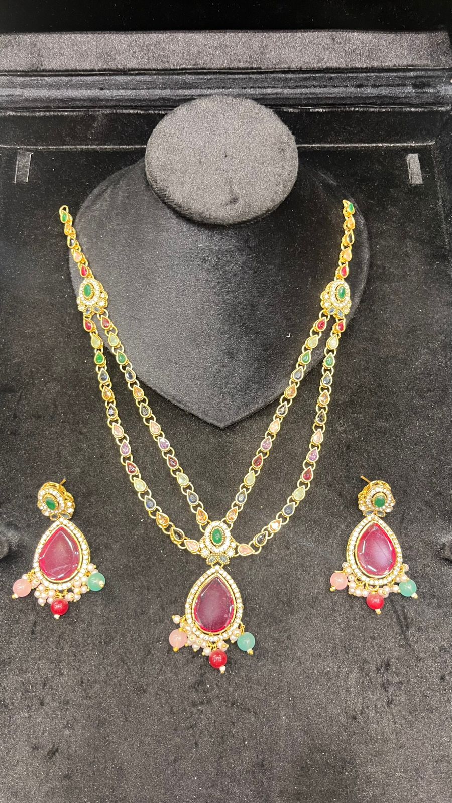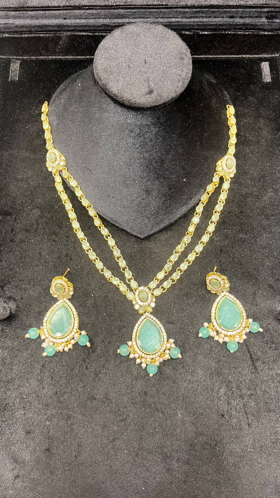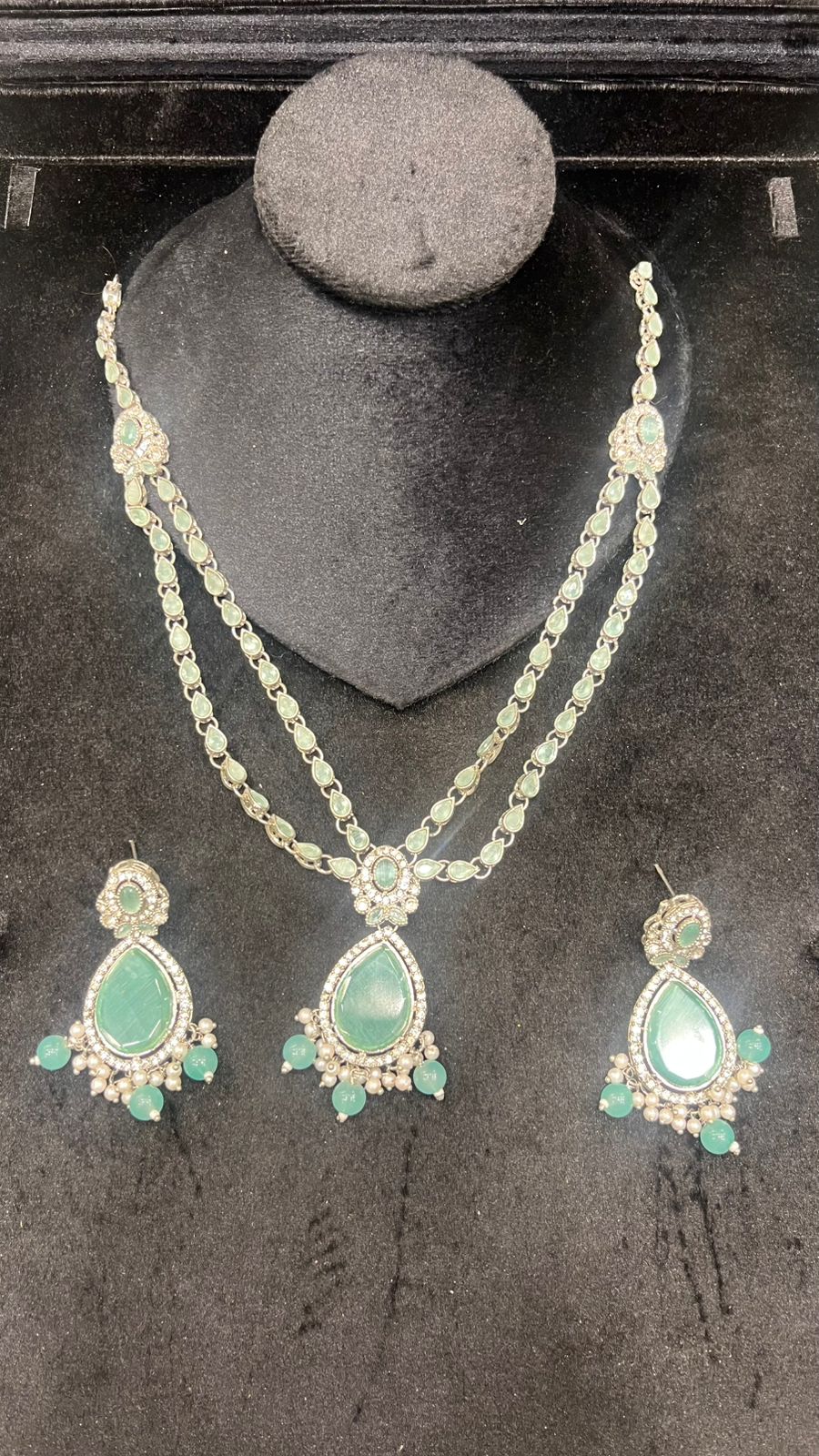 Designed to enhance any ethnic outfit, this complete jewelry set is ideal for weddings, mehndi and dholki functions, festive celebrations, or party wear. The classic combination of mirror shine, pearls, and stones adds a refined, graceful charm—instantly elevating both simple and heavily embellished dresses.This luxurious Mala Set features a beautifully handcrafted silver design adorned with mirror stones, pearls, and rich green beads. The long mala is paired with matching earrings and tikka, making it a perfect choice for brides, mehndi events, and festive wear. A true blend of elegance and tradition.