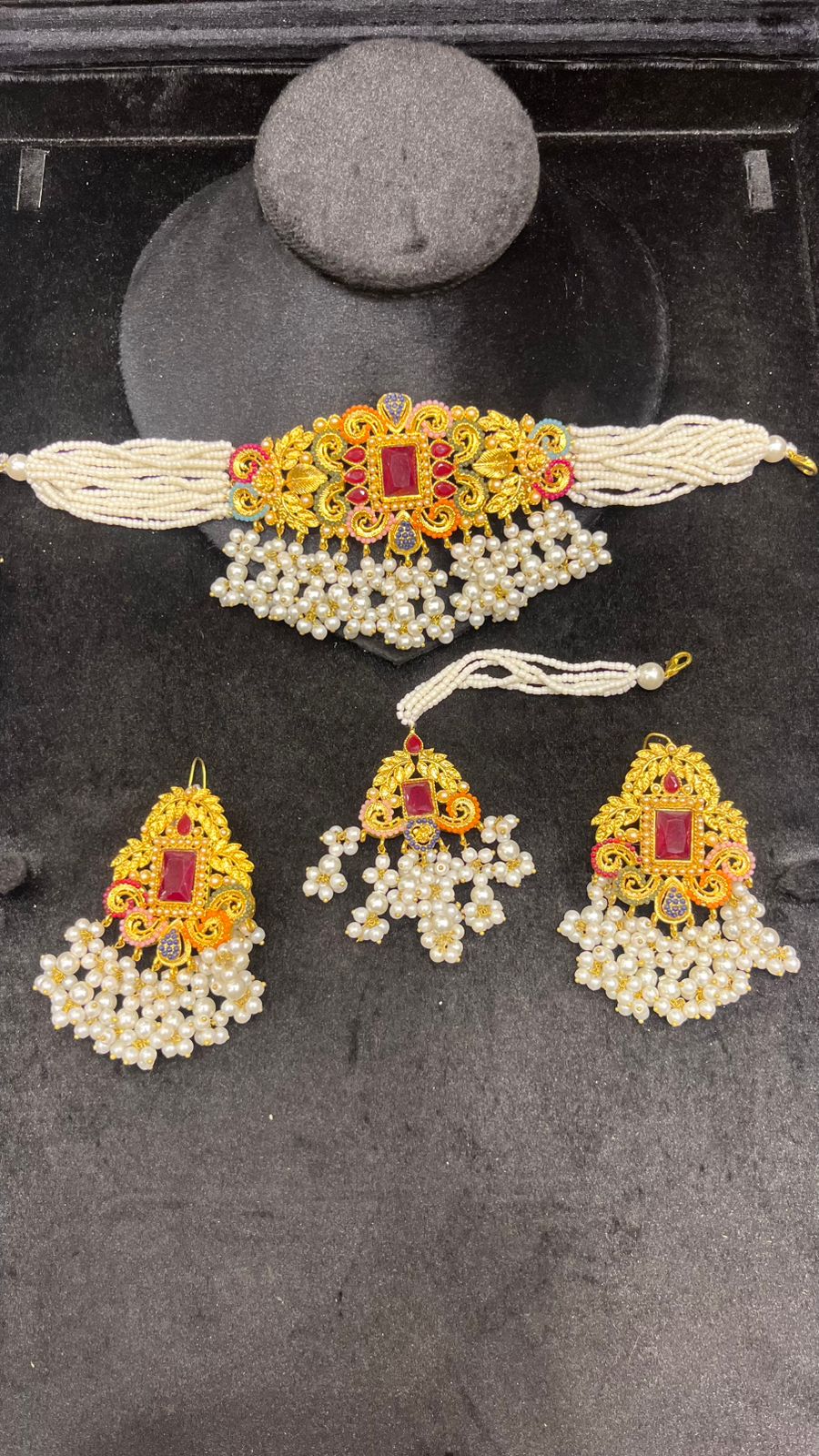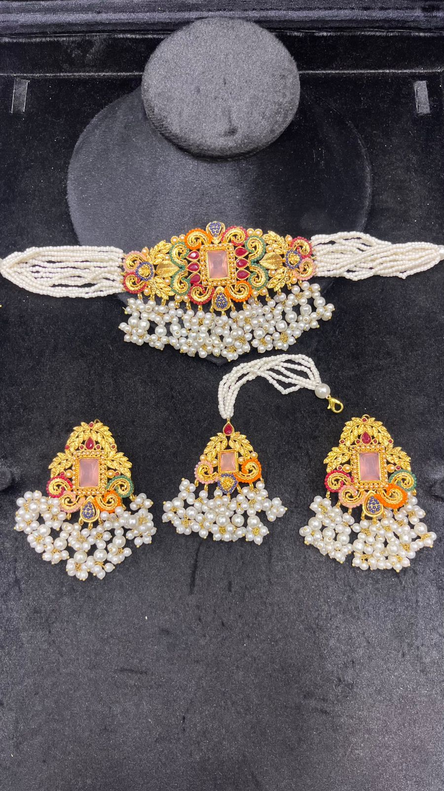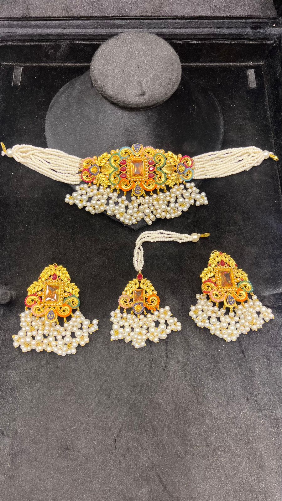 Elegant Beaded Choker Set with Stone Work and Pearl Drops