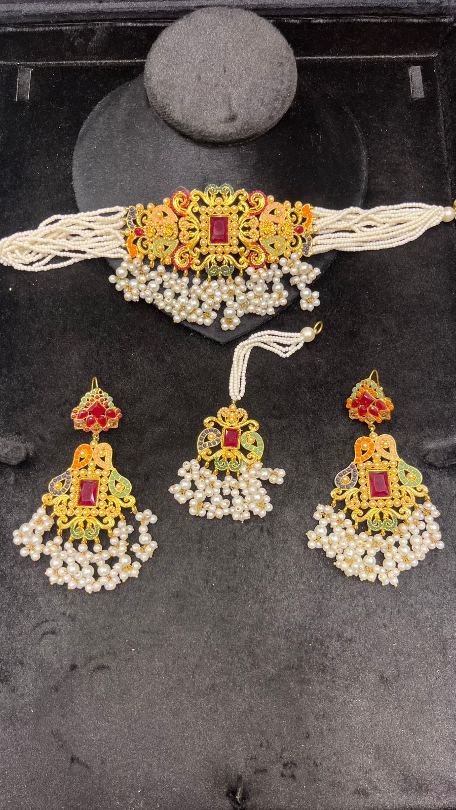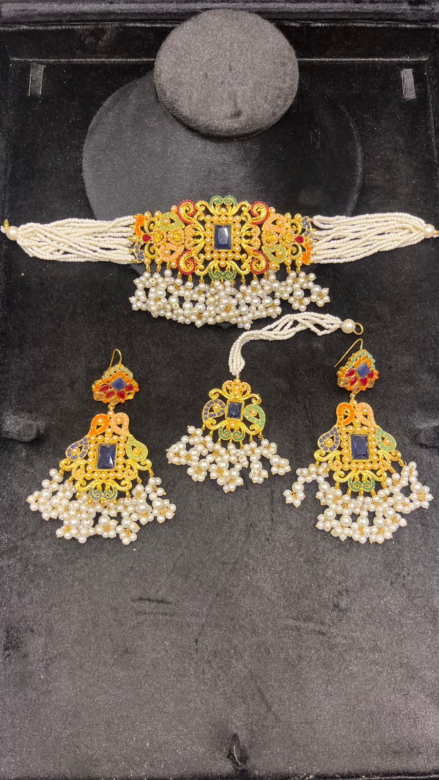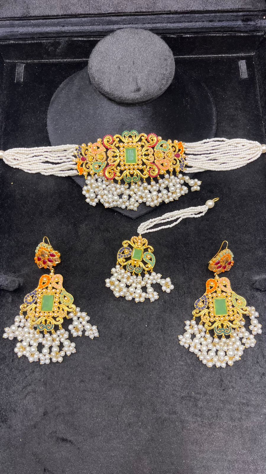 Elegant Beaded Choker Set with Stone Work and Pearl Drops