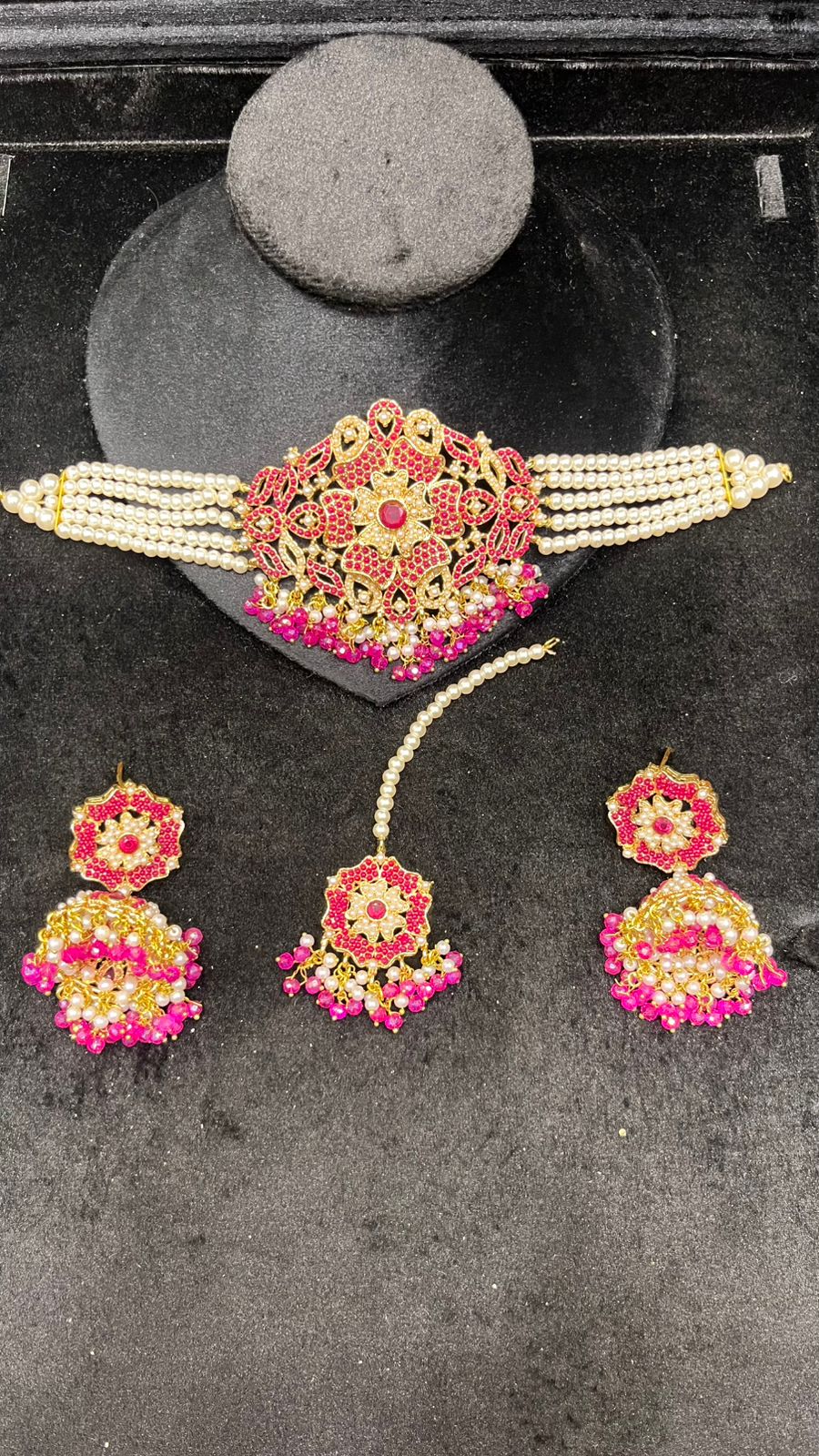 This royal pink choker set features delicate pastel beads, shimmering white stones, and elegant pearl drops. The fine craftsmanship and matching earrings with tikka make it ideal for brides and festive occasions.