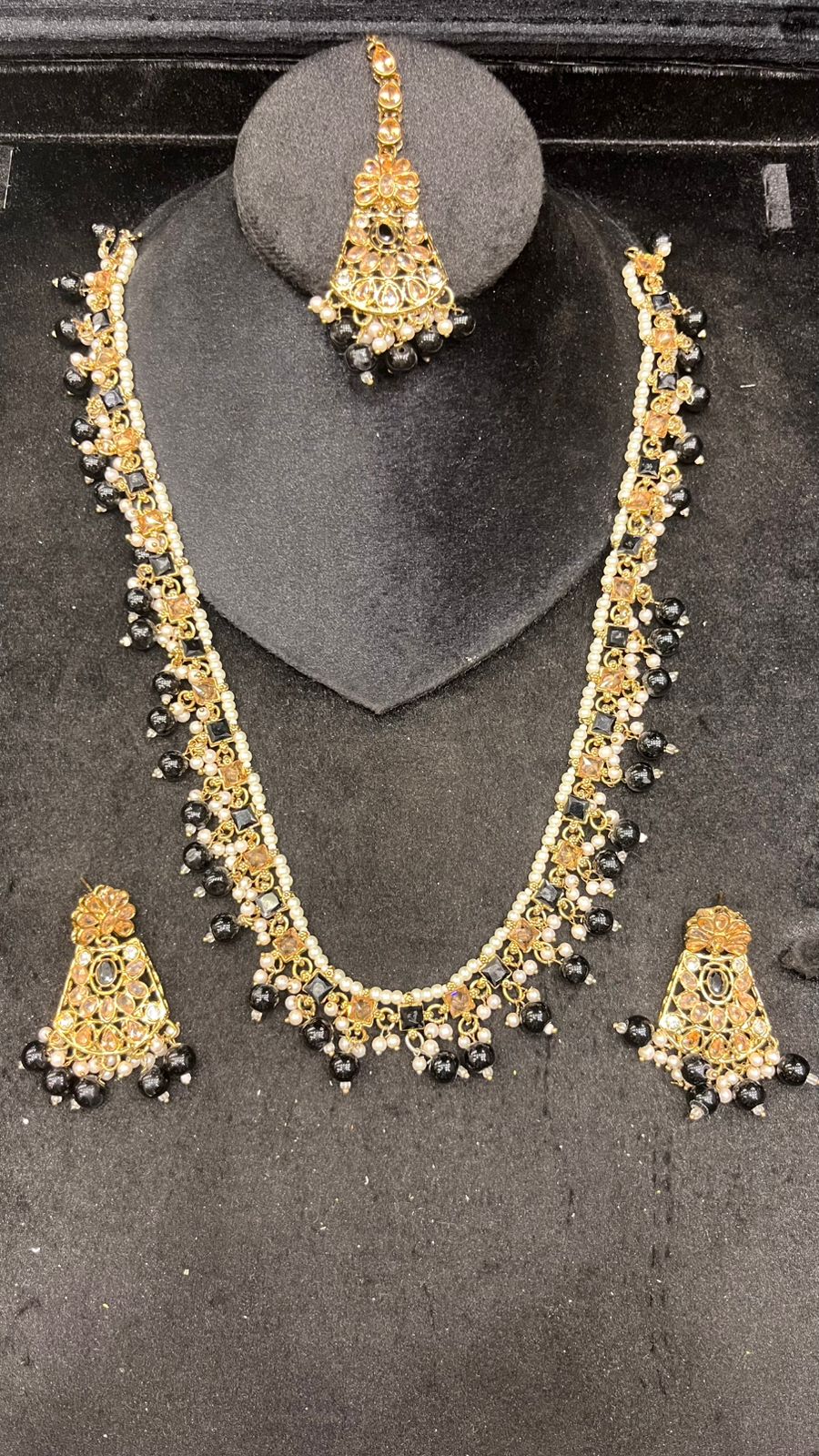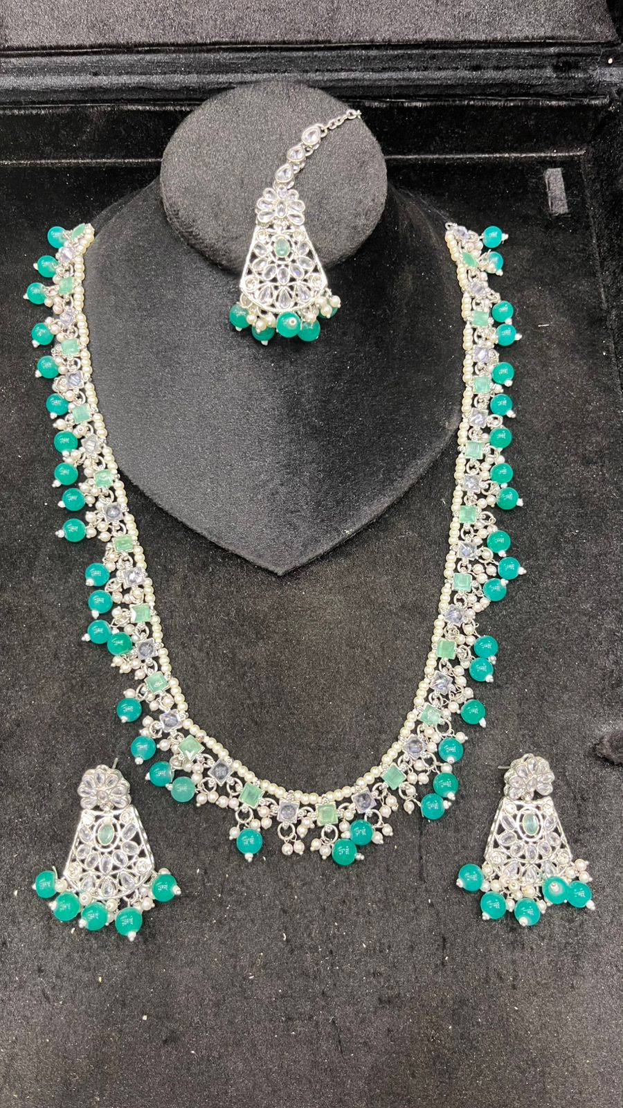 Designed to enhance any ethnic outfit, this complete jewelry set is ideal for weddings, mehndi and dholki functions, festive celebrations, or party wear.Elevate your traditional outfit with this handcrafted mala set. Its mirror-polished motifs, pearl accents, and green bead drops make it a perfect statement piece for weddings and celebrations.