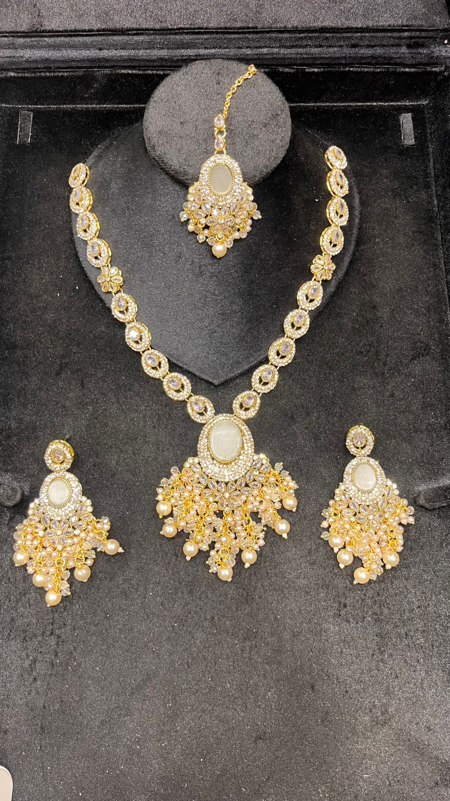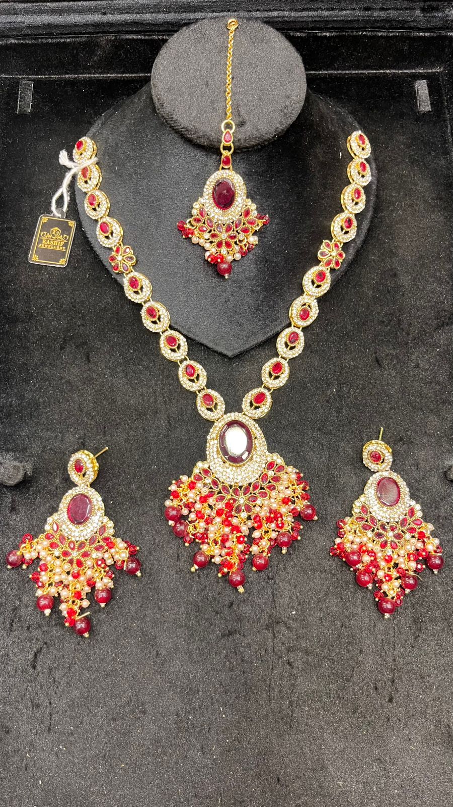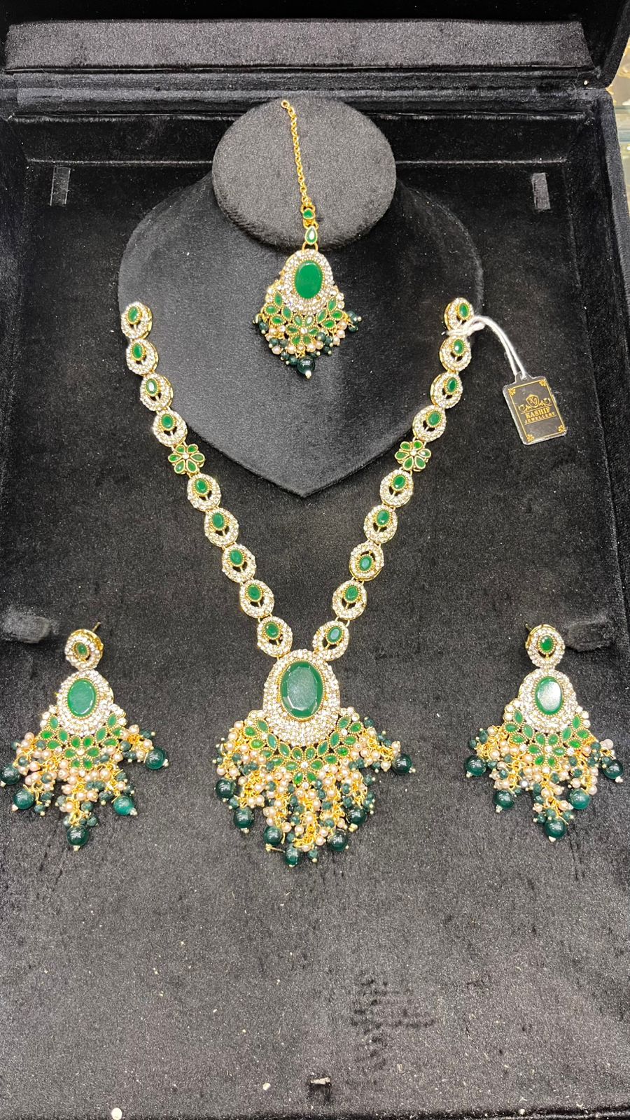 This stunning silver mala set features delicate mirror work paired with vibrant green stones, giving it a classy traditional look. Complete with matching earrings and tikka, it’s perfect for brides, party wear, and festive events.Designed to enhance any ethnic outfit, this complete jewelry set is ideal for weddings, mehndi and dholki functions, festive celebrations, or party wear.