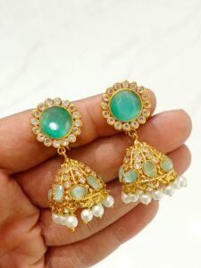 Add a touch of elegance to your festive or wedding look with these stunning traditional jhumka earrings. Featuring a gold-toned base, adorned with colored stones and delicate pearl drops, these earrings perfectly blend grace and glamour. Ideal for parties, weddings, or festive occasions. Lightweight and comfortable for long wear.