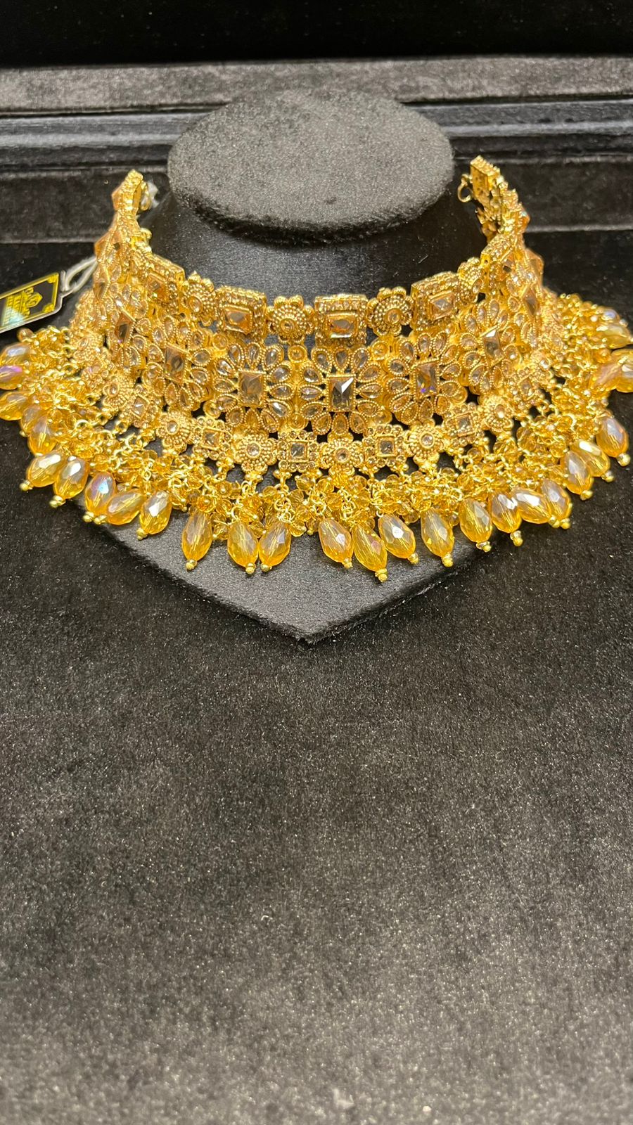 Elegant golden colour set featuring a choker, earrings, and matha patti decorated with rich green beads. Designed with fine craftsmanship and premium gold finish — perfect for mehndi, mayun, and wedding events. Lightweight yet grand in look.