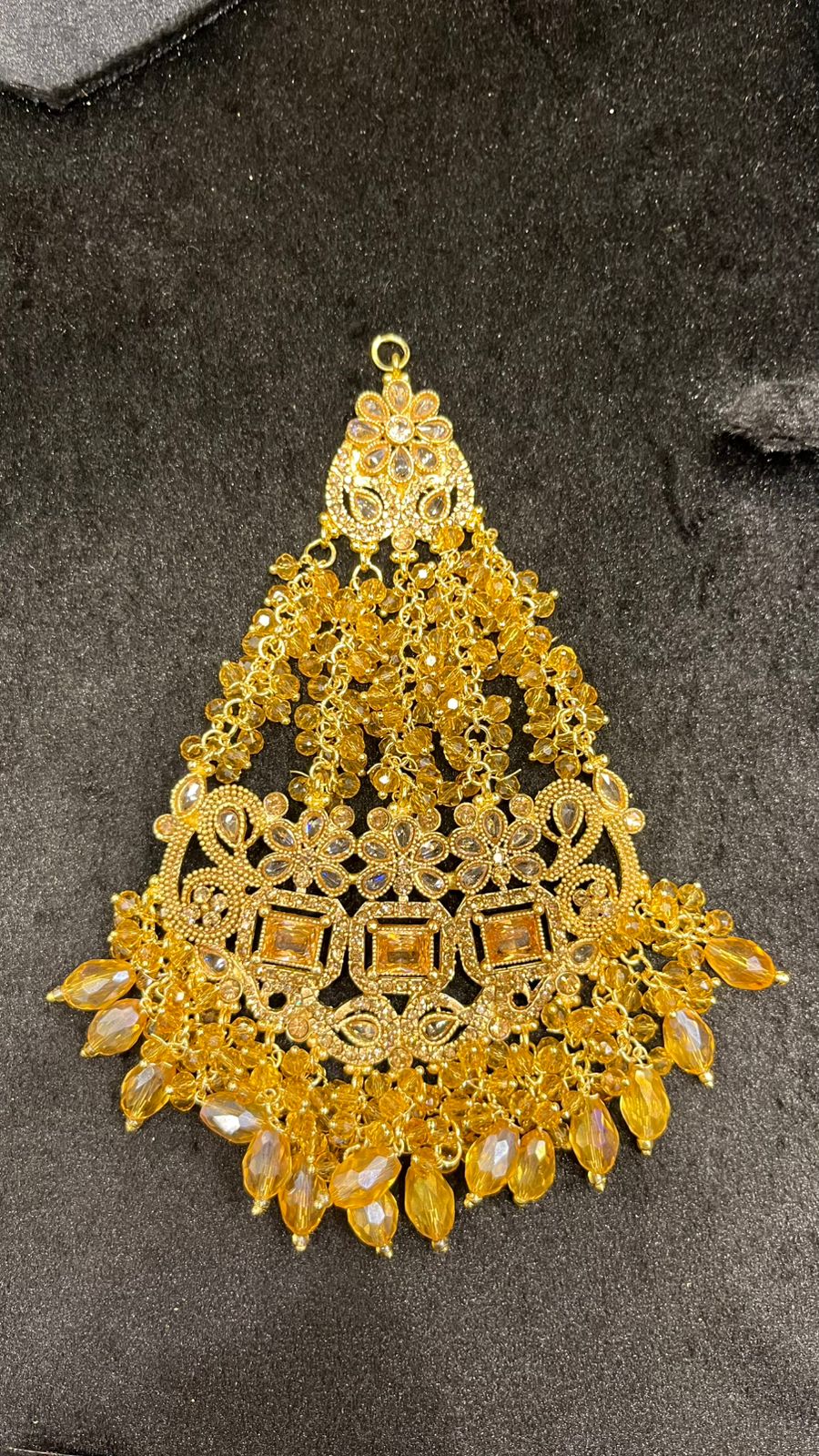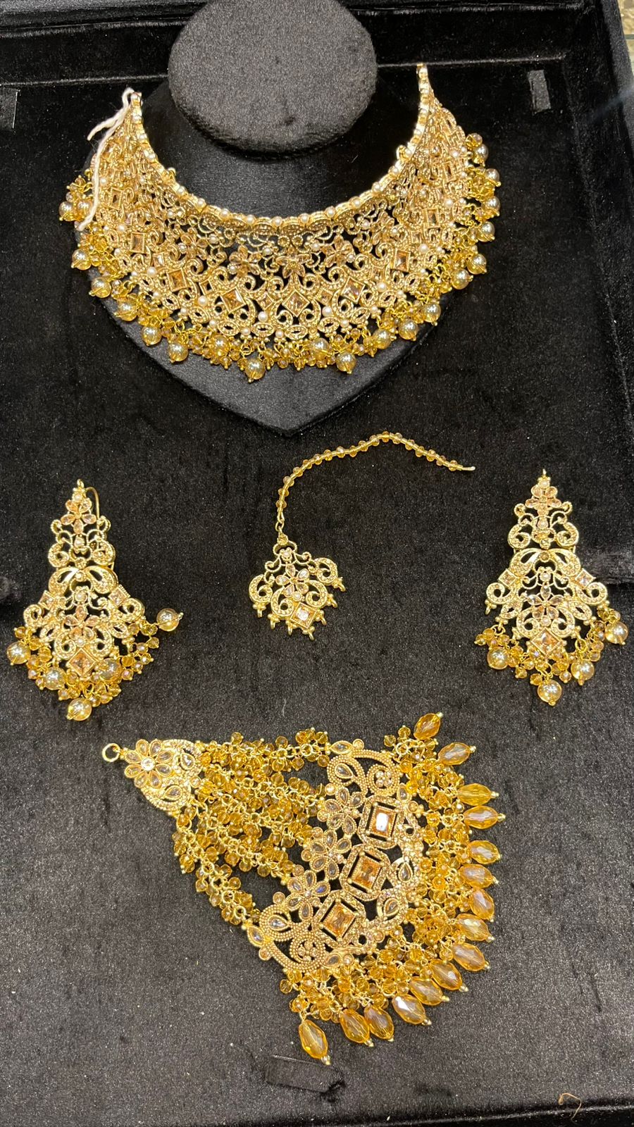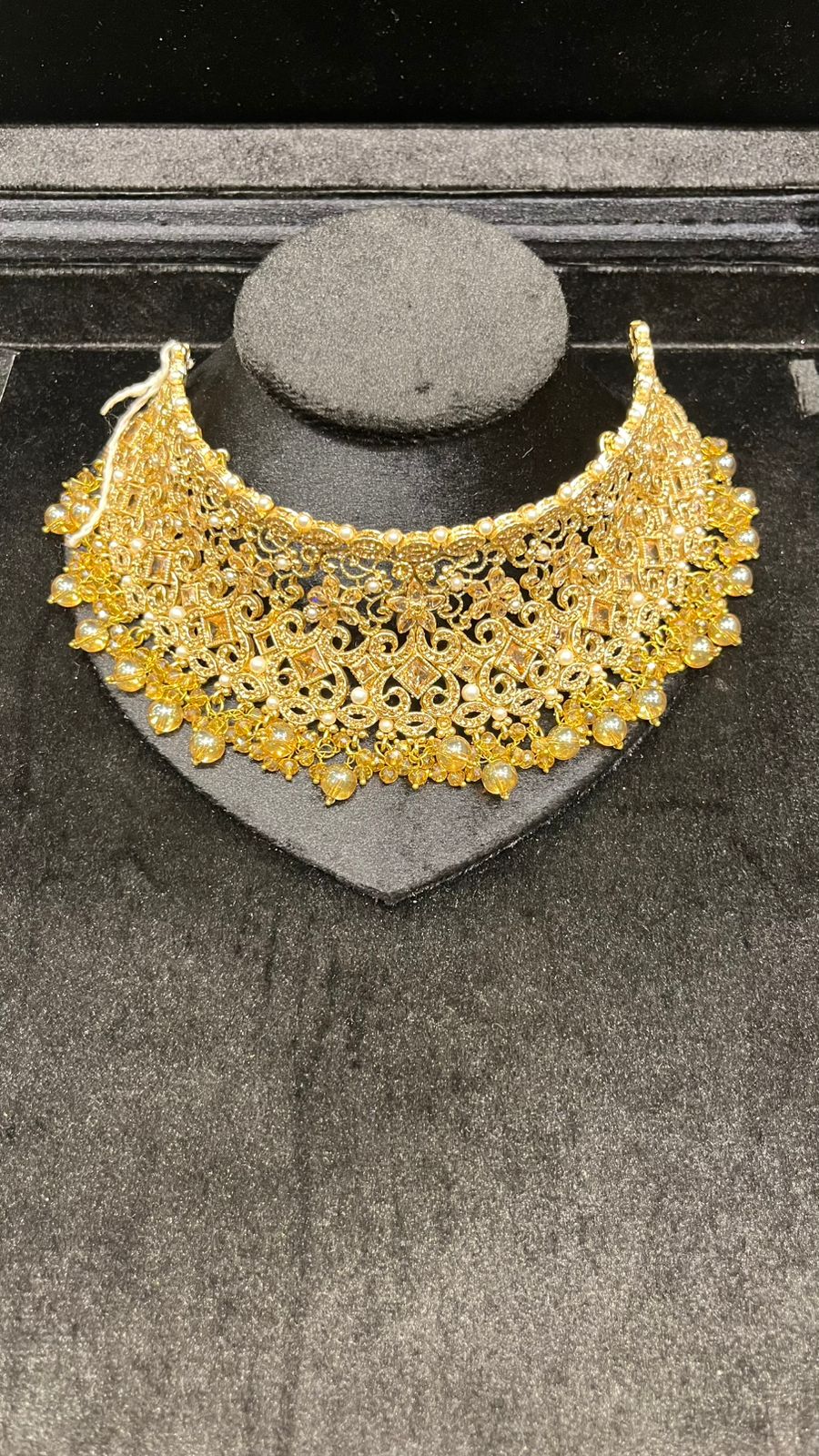 A regal golden colour set enhanced with deep green beads and intricate detailing. This stunning set includes a beautifully designed choker, matching earrings, and a matha patti — all crafted to perfection with rich gold polish. Ideal for weddings, festive occasions, or traditional functions, giving you a royal and elegant look.