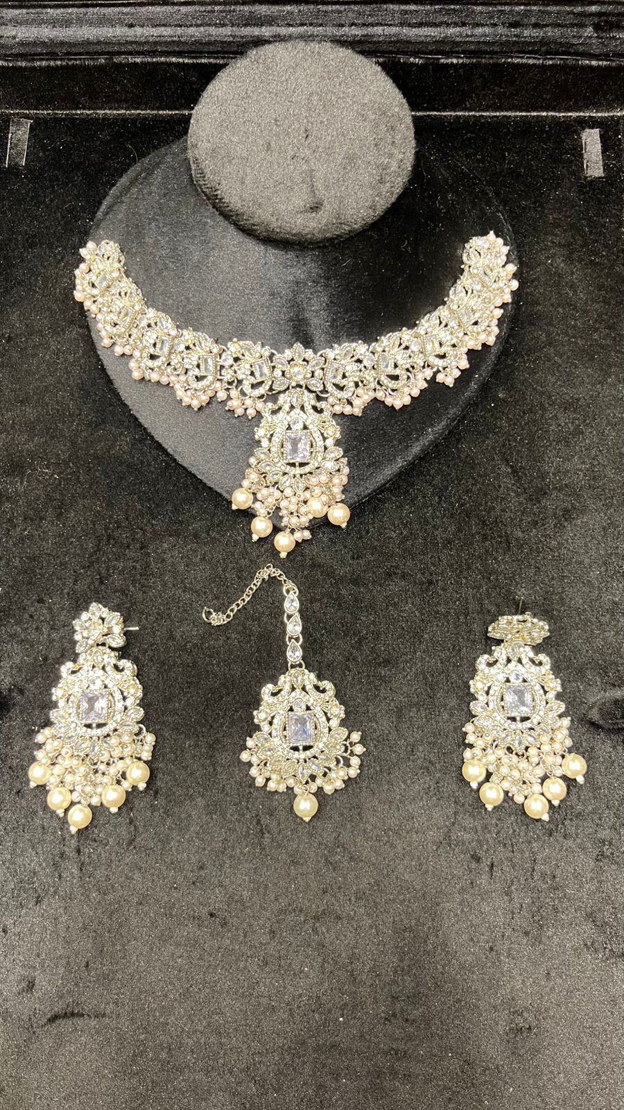 This elegant golden Kundan bridal choker set features intricate craftsmanship with sparkling stones and pearl detailing. The set includes a stunning choker necklace, matching earrings, and a delicate maang tikka — perfect for weddings, mehndi, or formal festive occasions. The timeless gold and white combination adds royal charm to any traditional outfit.