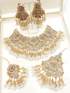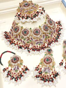 Add a royal touch to your bridal look with this exquisite Luxury Bridal Choker Set. Crafted with precision, this set features a beautifully designed choker, matching jhumka earrings, maang tikka, and additional accessories. The intricate detailing with maroon stones and gold accents gives it a traditional yet elegant appearance — perfect for brides and festive occasions.