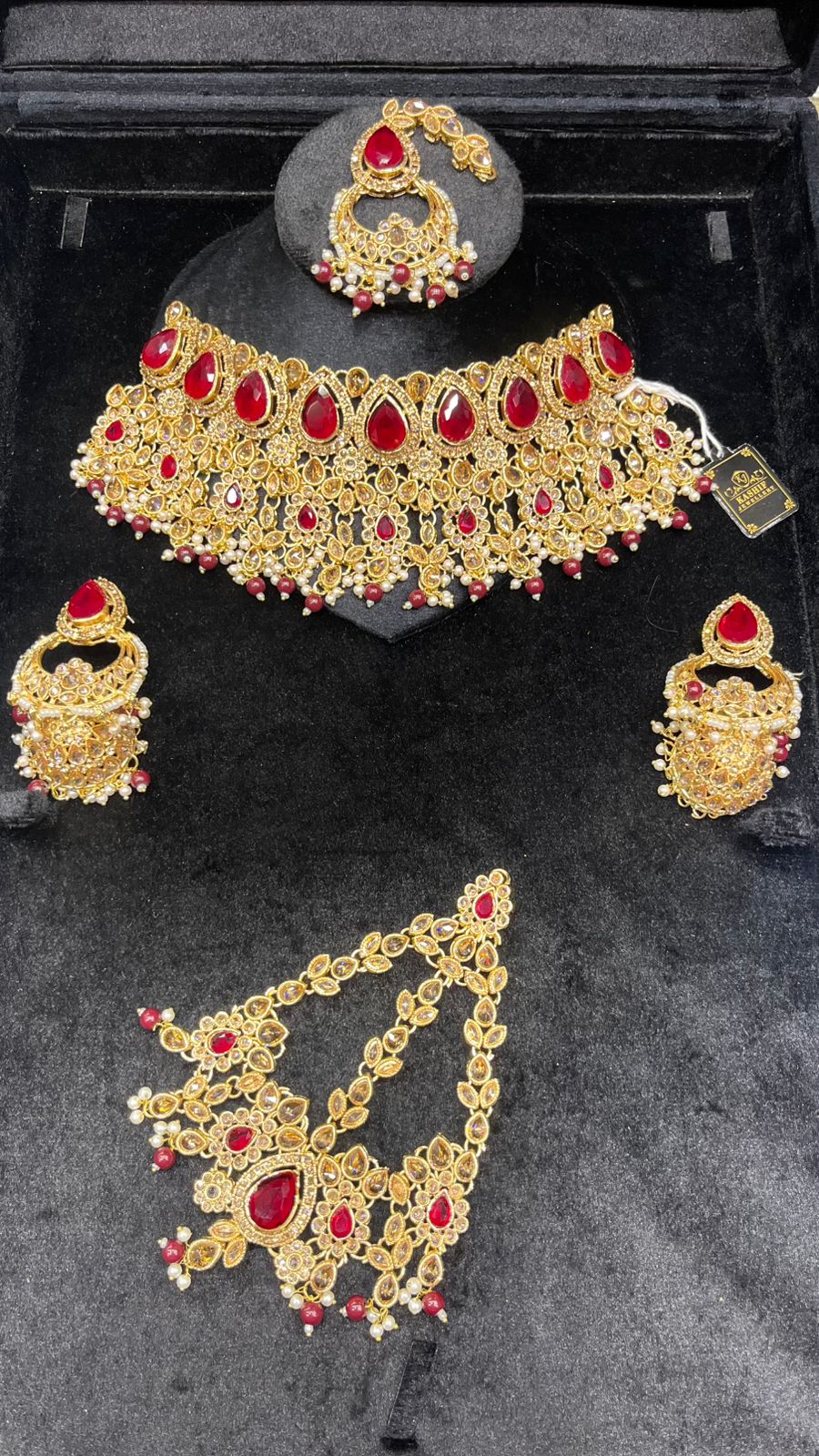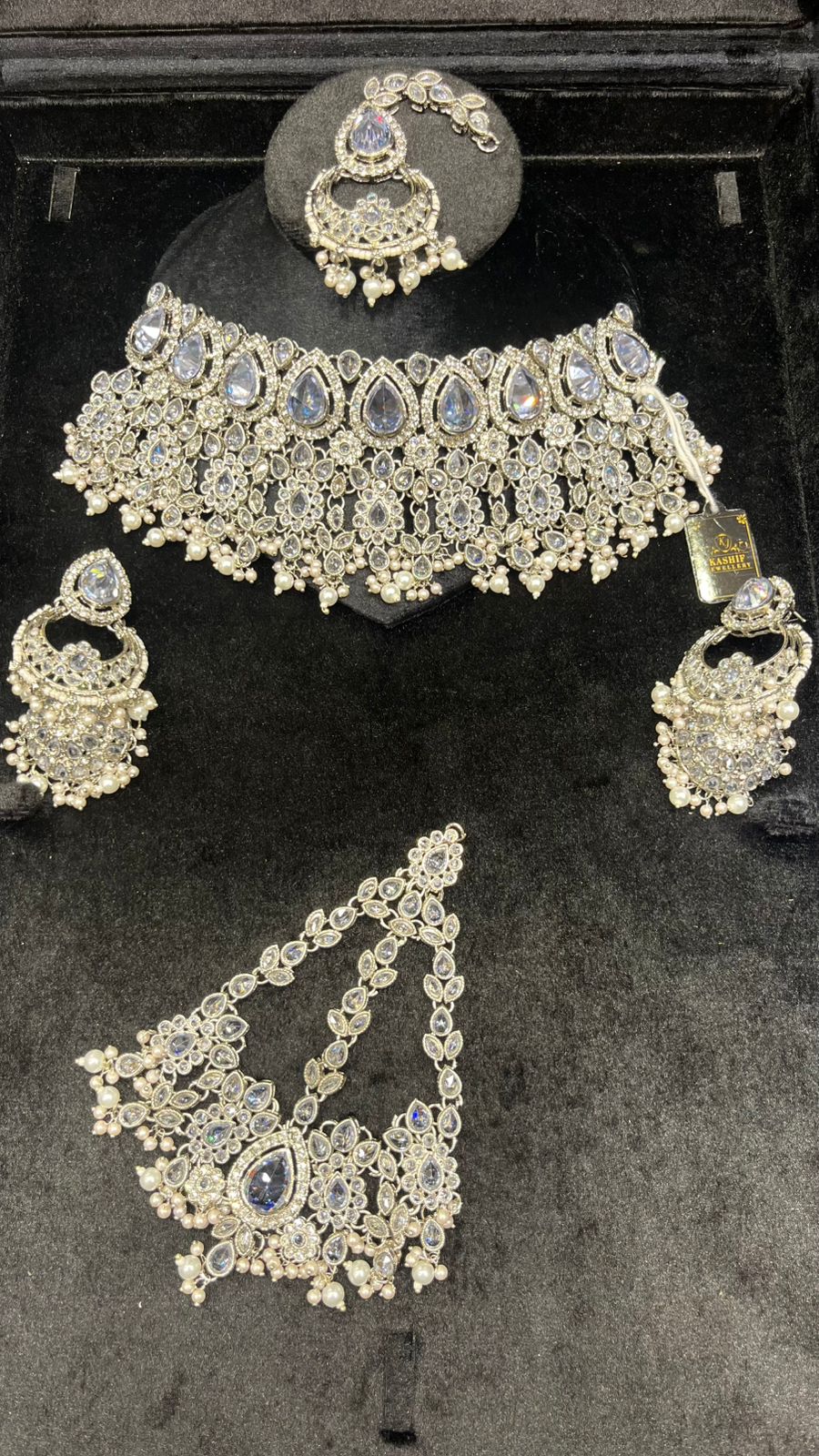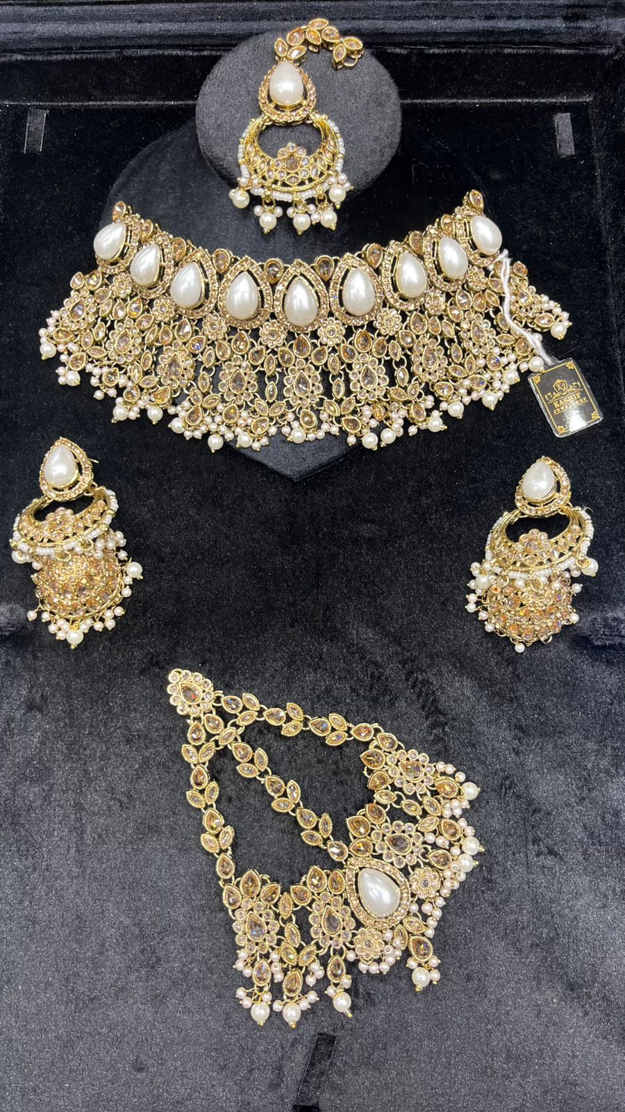 This exquisite bridal jewelry set features a stunning gold-plated choker adorned with lustrous white pearls and intricate Kundan stonework. The set includes a matching pair of earrings, a maang tikka, and a statement choker designed to add royal elegance to any bridal or festive look. Handcrafted with detailed floral patterns and fine pearl drops, this set perfectly complements traditional wedding attire.