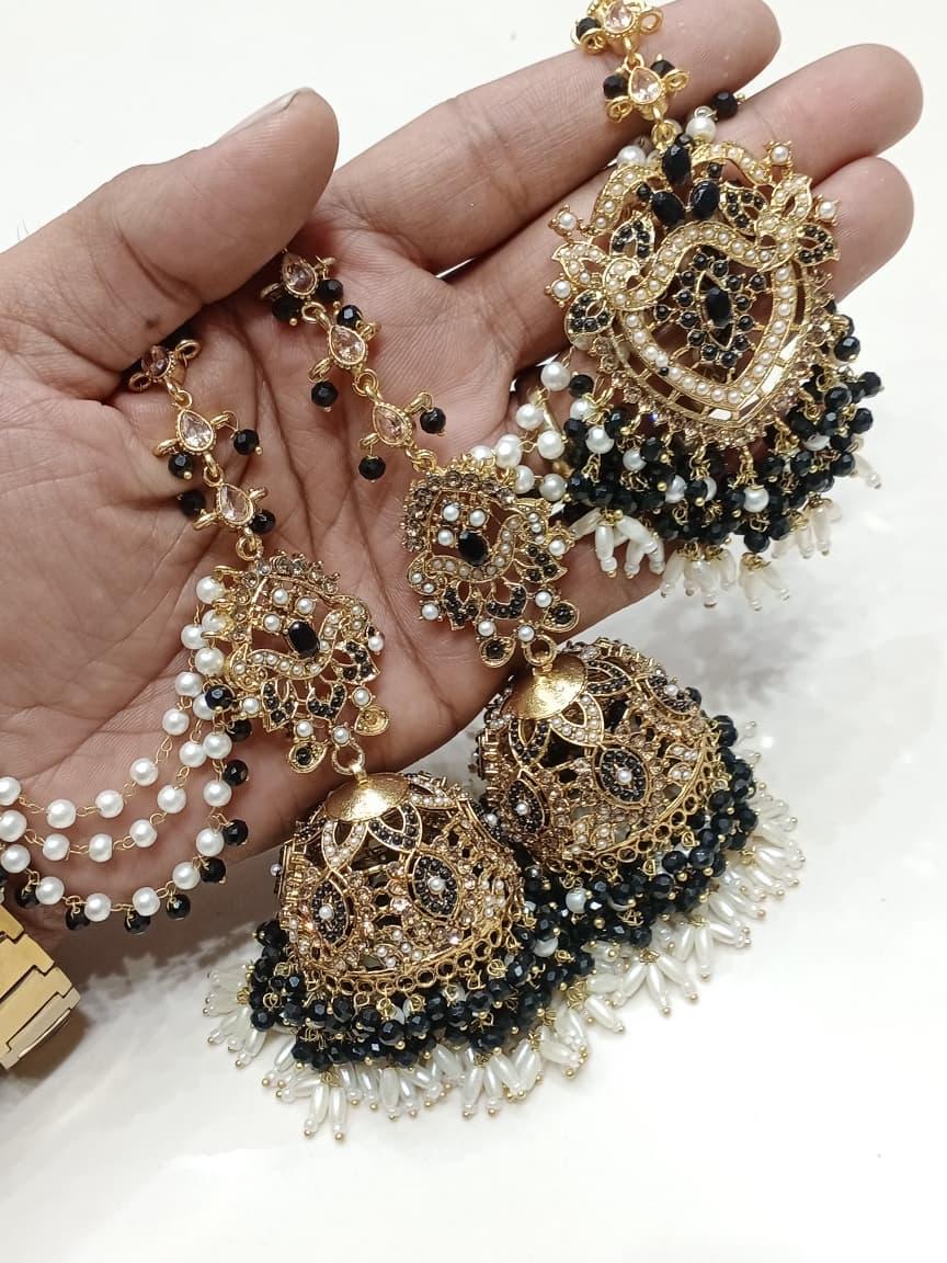 Add a royal touch to your look with these exquisite golden jhumka earrings. Beautifully crafted with intricate filigree work, sparkling stones, and delicate pearl detailing, this jewelry set is perfect for weddings, festive occasions, or cultural celebrations. The elegant blend of gold tones and ivory pearls gives a timeless, regal charm.