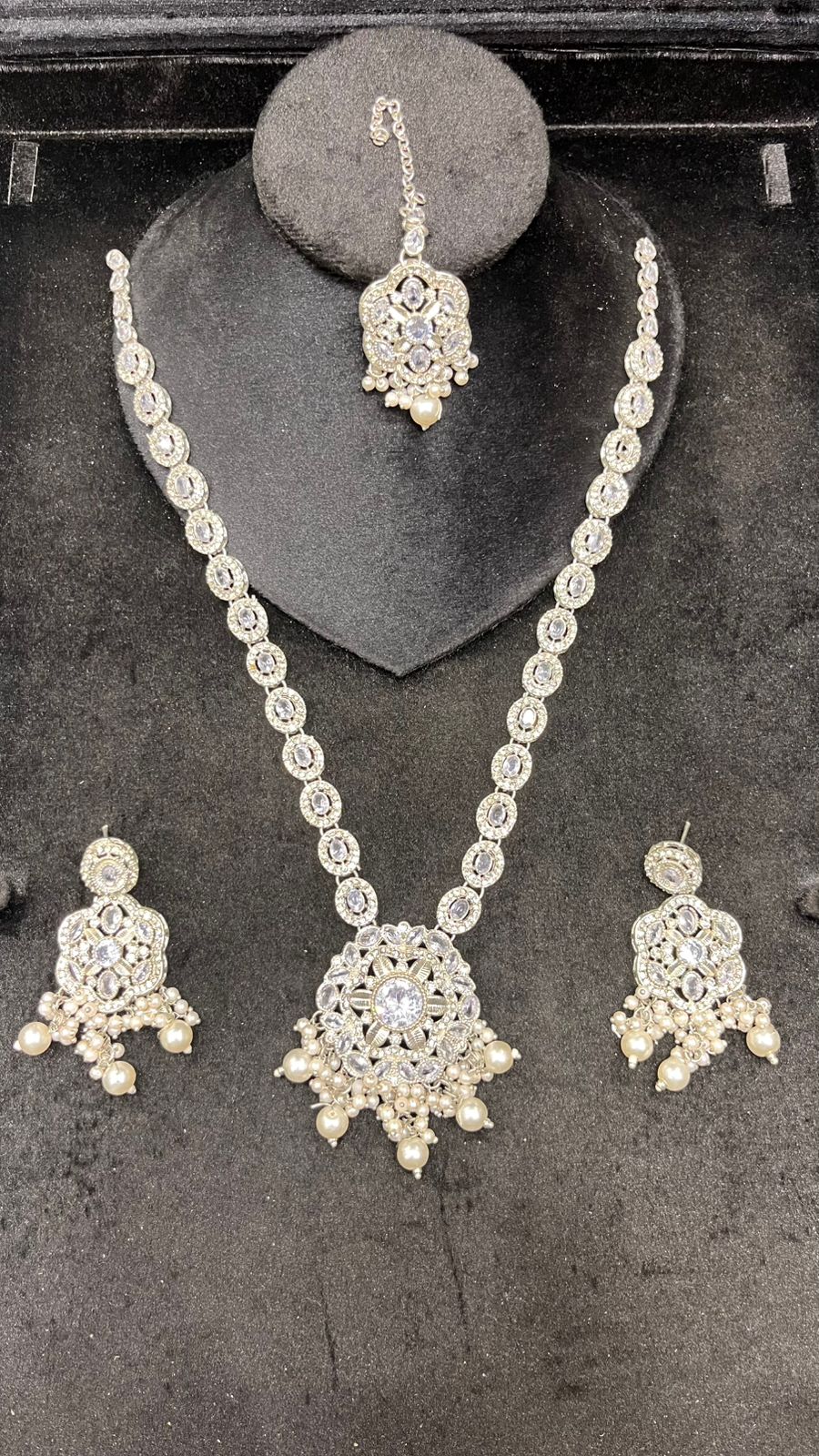 A beautifully handcrafted silver-tone mala set featuring intricate mirror work and elegant green stone detailing. The mala comes with matching earrings and tikka, decorated with pearl and green bead drops. Perfect choice for weddings, mehndi, mayoun, and festive occasions. The lightweight design makes it stylish and comfortable for long wear.