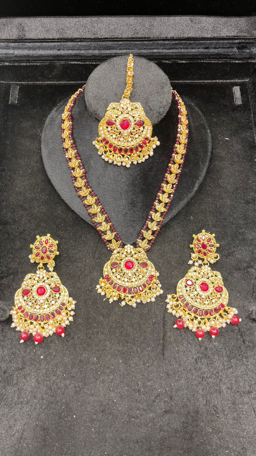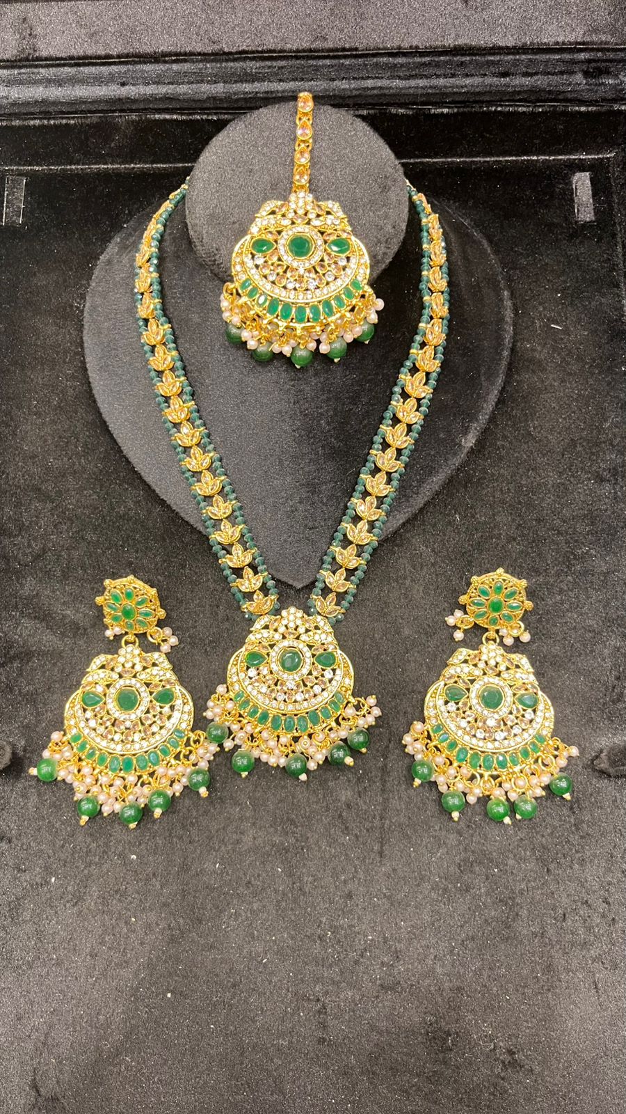 This stunning silver mala set features delicate mirror work paired with vibrant green stones, giving it a classy traditional look. Complete with matching earrings and tikka, it’s perfect for brides, party wear, and festive events.Designed to enhance any ethnic outfit, this complete jewelry set is ideal for weddings, mehndi and dholki functions, festive celebrations, or party wear.