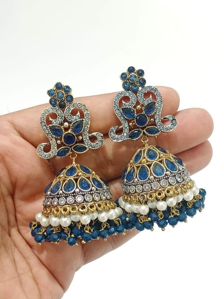 Elegant handcrafted multicolor Kundan Jhumka earrings featuring intricate stonework in red, green, and blue hues. Adorned with sparkling white crystals and delicate pearl drops, these earrings add a royal charm to any festive or bridal look. Perfect for weddings, parties, and traditional occasions. Lightweight and comfortable for long wear.