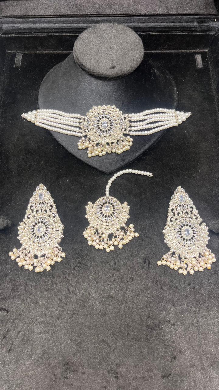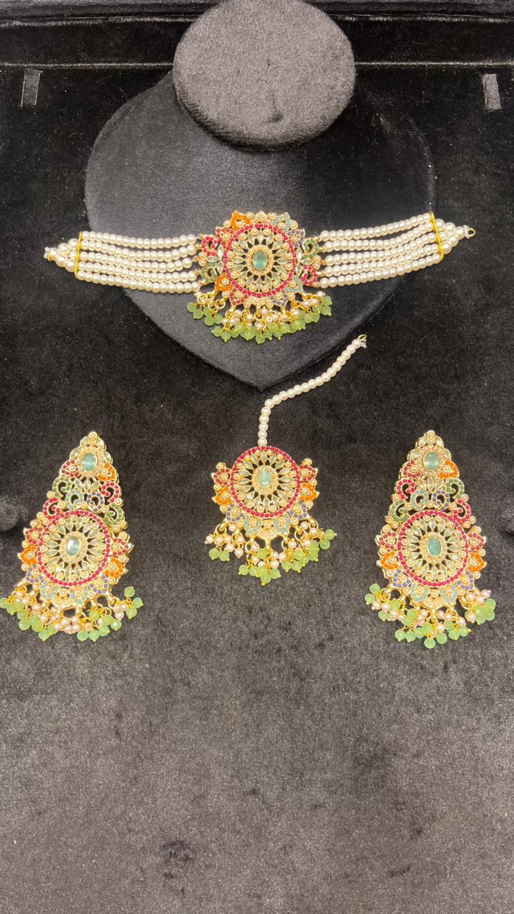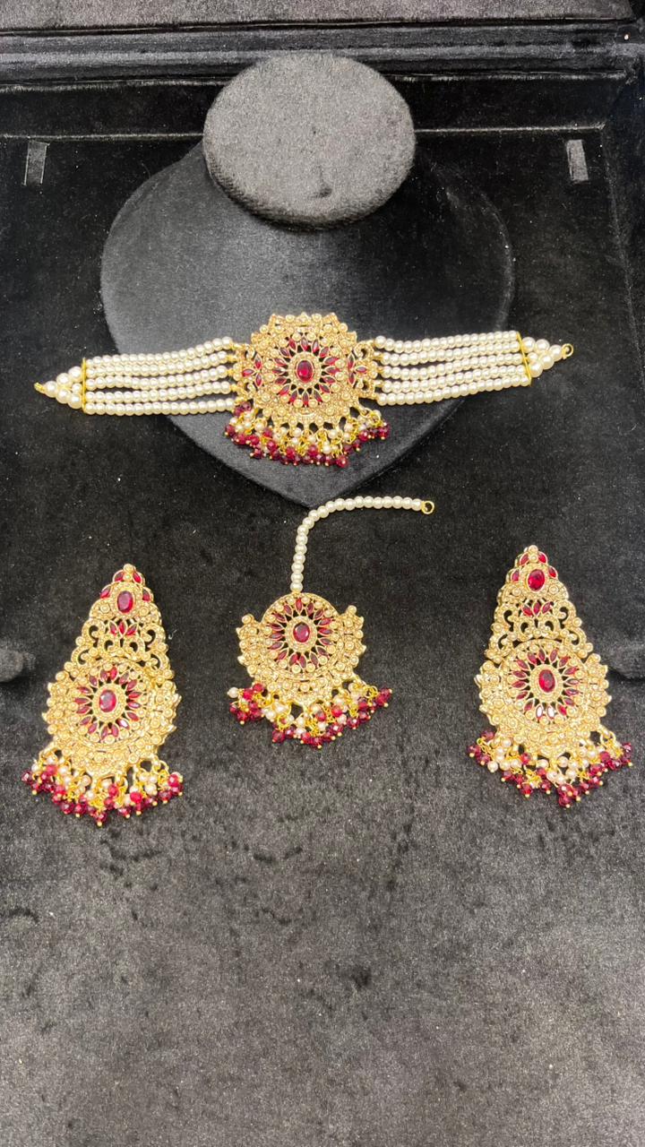 This royal pink choker set features delicate pastel beads, shimmering white stones, and elegant pearl drops. The fine craftsmanship and matching earrings with tikka make it ideal for brides and festive occasions.