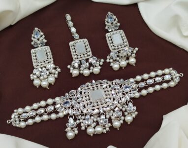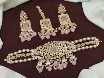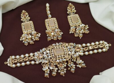 This exquisite choker necklace set is beautifully designed with premium stones, pearls, and gold-plated detailing. It comes with matching earrings, making it the perfect choice for weddings, parties, and festive occasions.