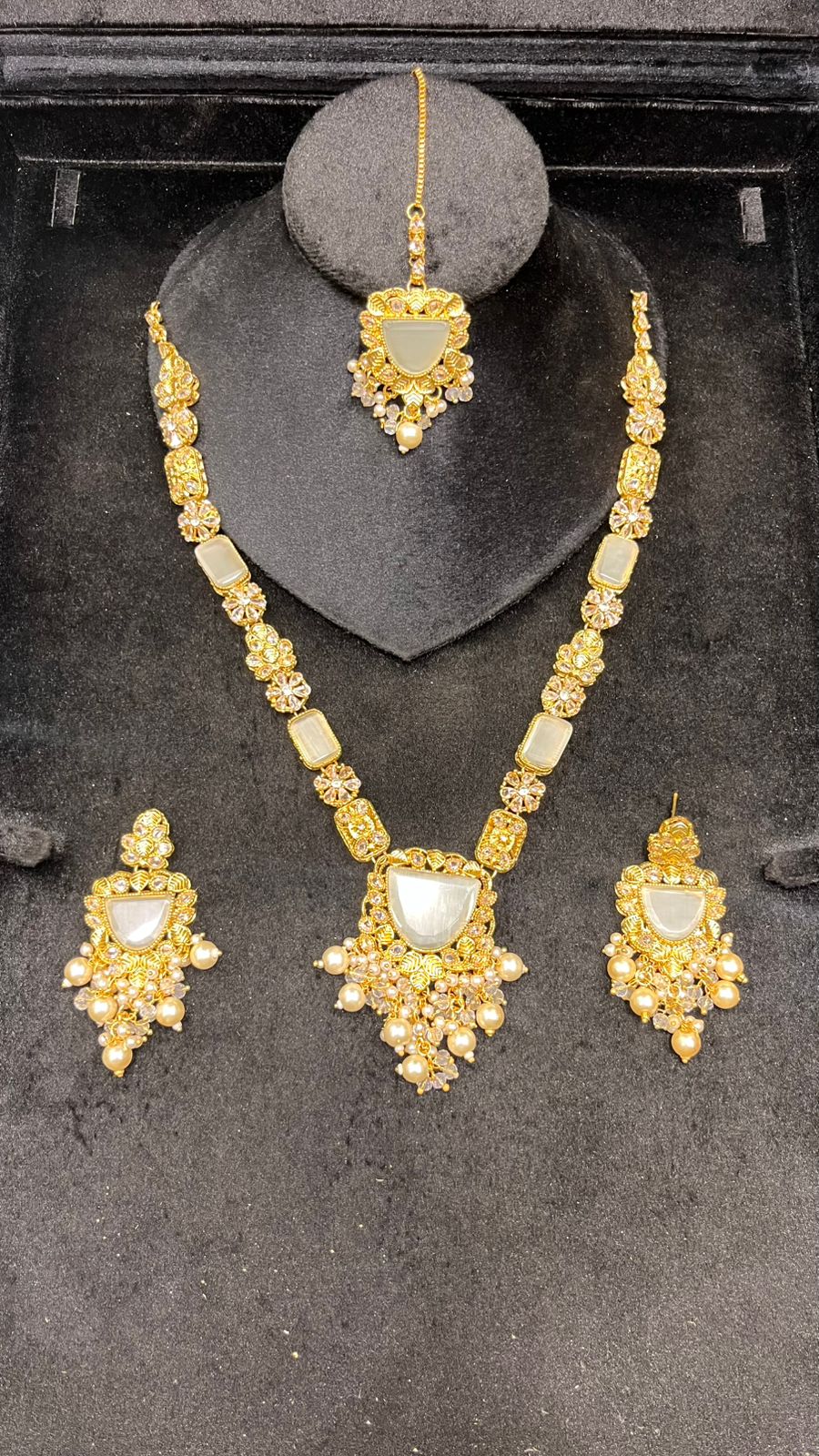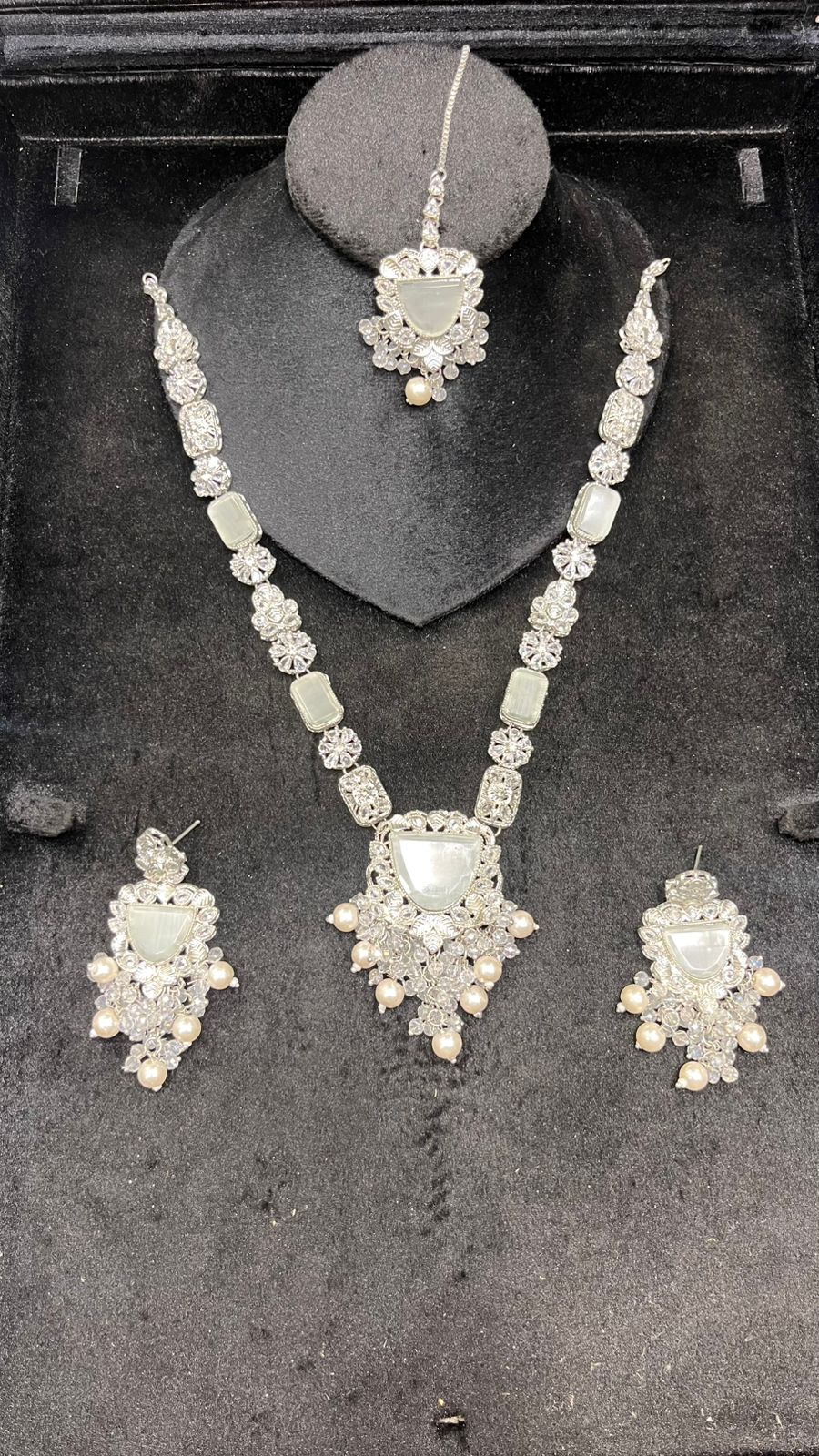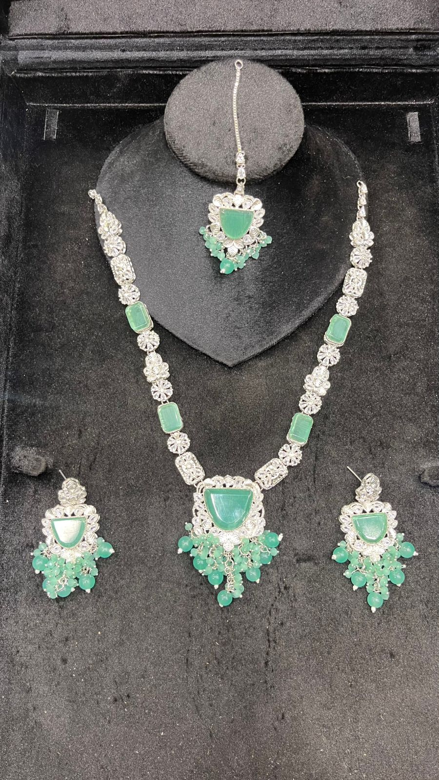 Designed to enhance any ethnic outfit, this complete jewelry set is ideal for weddings, mehndi and dholki functions, festive celebrations, or party wear.A beautifully designed ethnic mala set crafted with silver-tone detailing, mirror stones, pearls, and green beads. Ideal for mehndi, mayoun, dholki, or formal occasions.