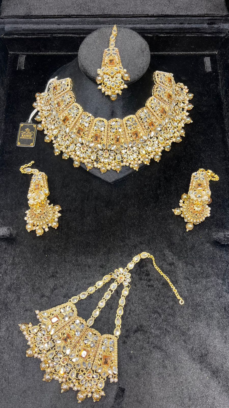 This exquisite bridal jewelry set features a stunning gold-plated choker necklace adorned with premium Kundan work, delicate floral motifs, and soft pink stone drops. The set includes matching earrings, a maang tikka, and a hand harness (haathphool), designed to bring a regal touch to any bridal or festive look. Perfect for weddings, mehndi, or special occasions, this handcrafted masterpiece blends traditional elegance with timeless charm.