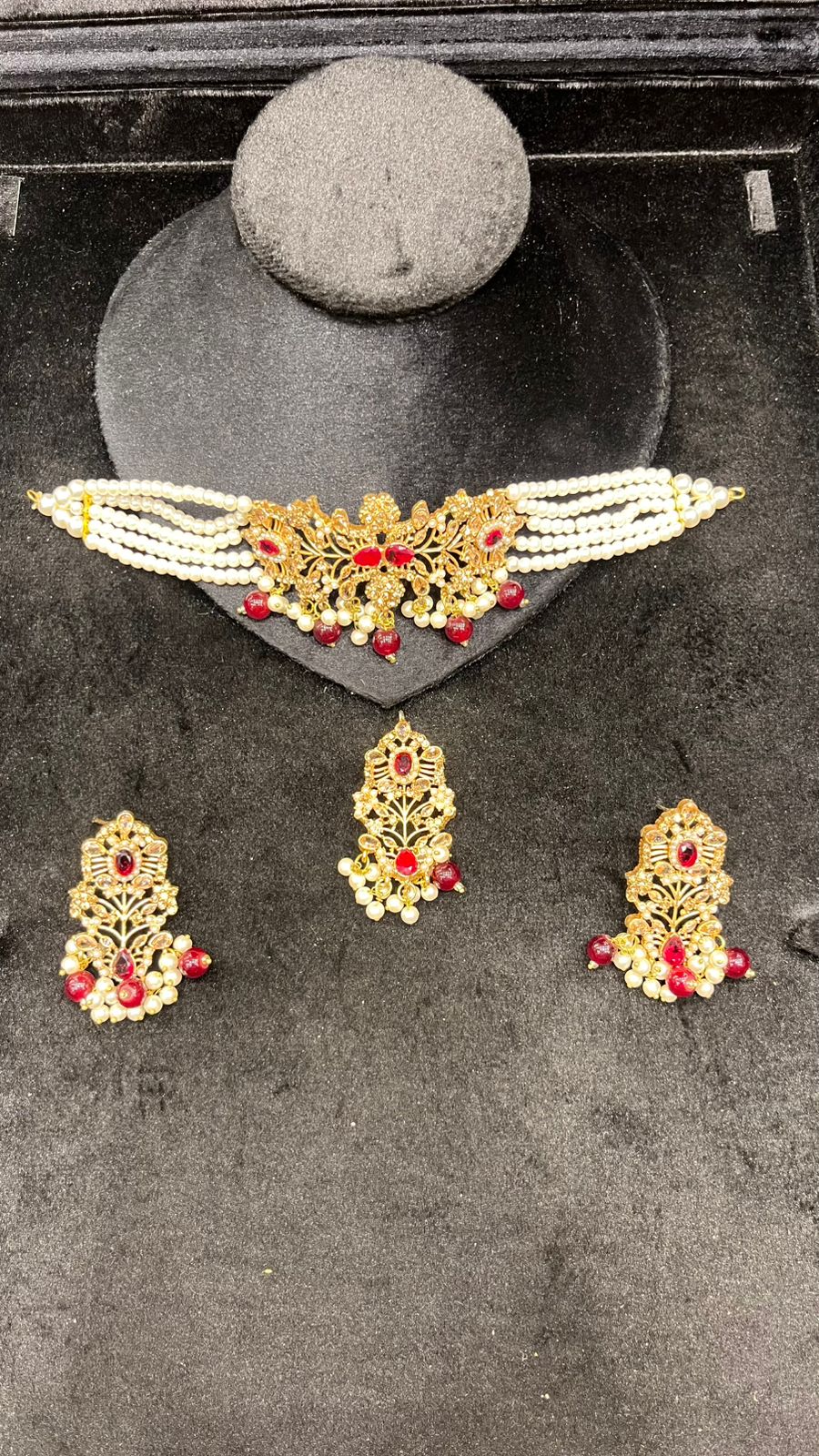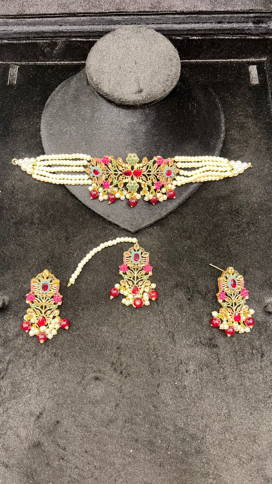 This elegant choker set combines soft pink beads with intricate white stone detailing, making it a timeless piece of art. Whether it’s a wedding, mehndi, or formal event — this set enhances your look with charm and sophistication.