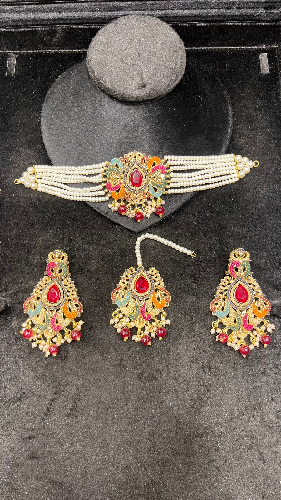 Turn heads with this exquisite pastel pink choker jewelry set, featuring delicate bead strands and a shimmering stone centerpiece. Perfectly complemented by matching earrings and tikka, this set adds a royal touch to any festive or bridal outfit.