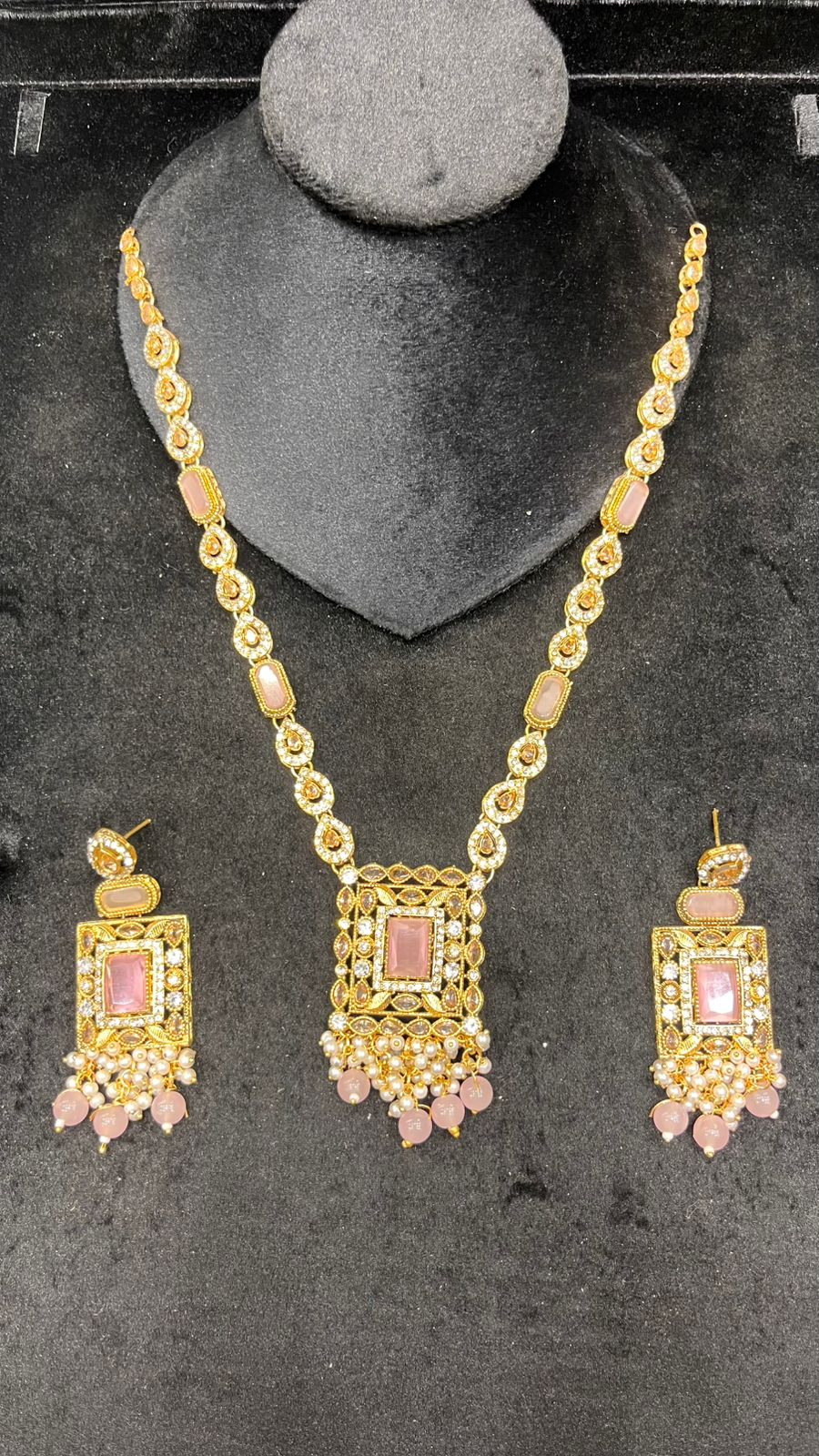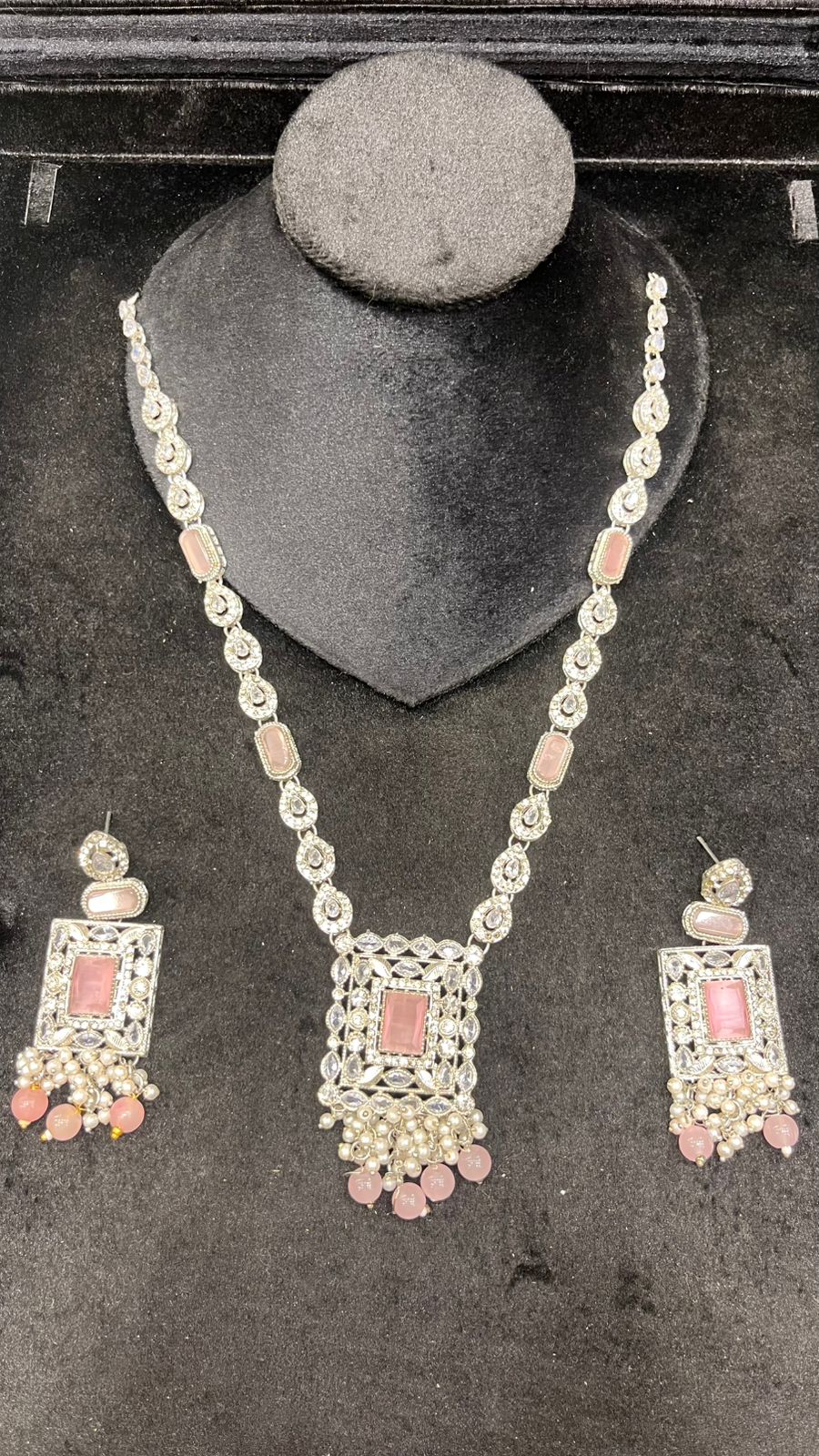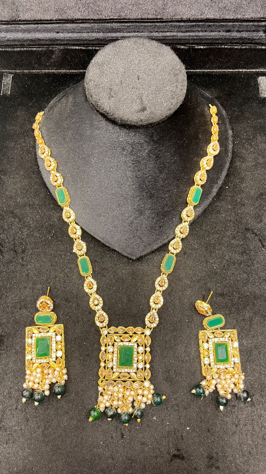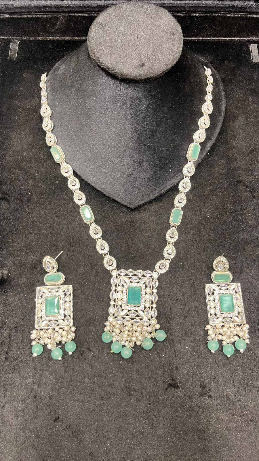 This exquisite silver mala set features a beautifully handcrafted mirror-work pendant, adorned with delicate pearls and vibrant green stone drops that create a captivating traditional look. The intricate detailing and premium finish give the set a luxurious feel, making it perfect for brides and bridesmaids alike.Designed to enhance any ethnic outfit, this complete jewelry set is ideal for weddings, mehndi and dholki functions, festive celebrations, or party wear. The classic combination of mirror shine, pearls, and stones adds a refined, graceful charm—instantly elevating both simple and heavily embellished dresses.