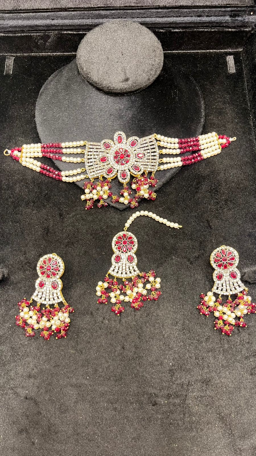 Inspired by timeless heritage, this ethnic choker jewelry set blends tradition with elegance. Adorned with pink beads, kundan stones, and delicate pearls, it captures the essence of royal charm — perfect for brides and festive wear.